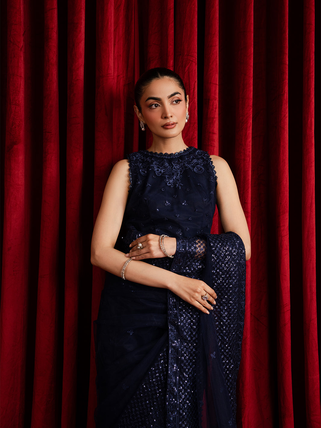 Description: Bold, captivating, and timeless — this red saree is designed to embody the essence of celebration and elegance. Crafted in delicately embroidered net, the silhouette is adorned with intricate embroidery that adds depth, texture, and graceful movement to every...