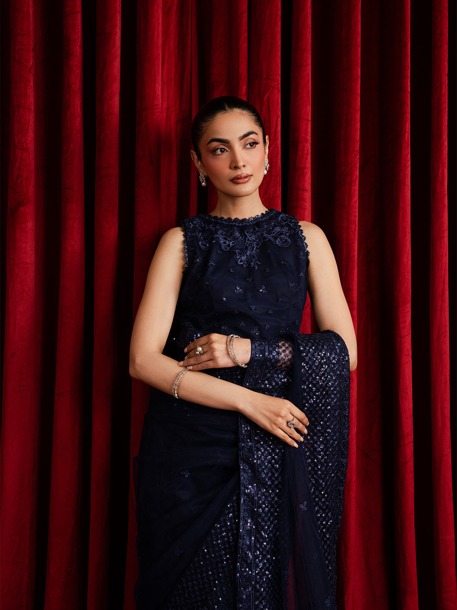 Description: Refined and effortlessly sophisticated, this blue saree embodies modern elegance with a touch of timeless charm. Crafted in delicate embroidered net, the ensemble features intricate detailing that creates a soft, luminous shimmer with every movement. The blouse is beautifully...