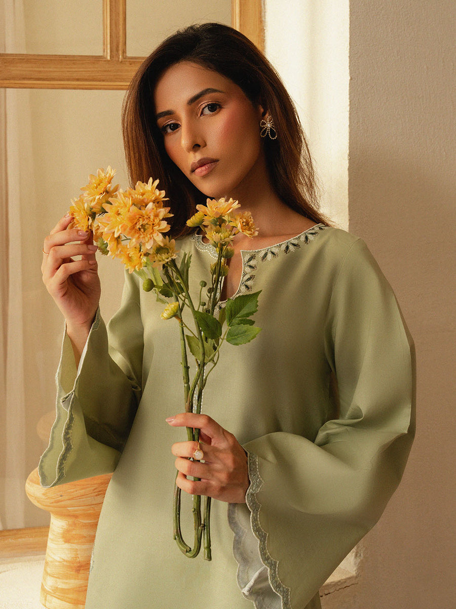Like a portrait painted in earthy tones, Da Vina brings depth and refinement to your wardrobe. This olive-green Karandi two-piece is beautifully accentuated with tonal embroidery along the neckline, sleeves, and borders — intricate yet understated, much like the fine...