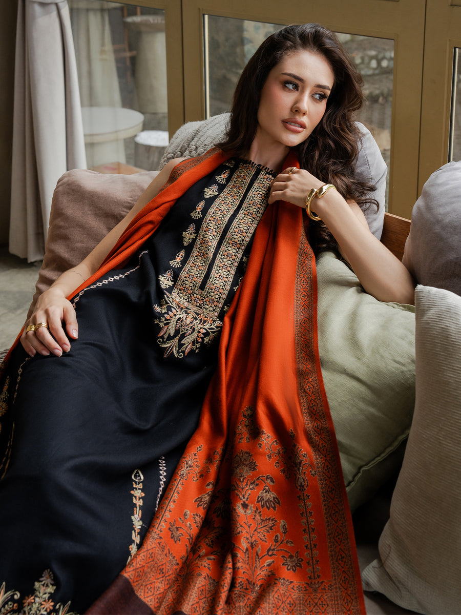 Description: Wrapped in midnight black, Asteria exudes understated power and grace. Crafted from premium Italian wool, it is detailed with subtle embroidery and paired with a richly patterned jacquard shawl, creating an aura of refined sophistication Shirt : Fabric Italian...