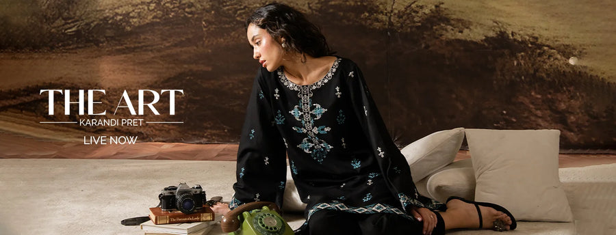 Like verses woven into fabric, Poème tells a story of elegance in black. This two-piece Karandi outfit is adorned with delicate motifs in teal and ivory embroidery, scattered like poetic stanzas across a dark canvas. The neckline and borders are...